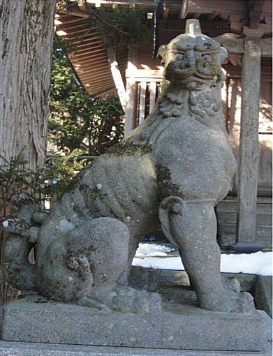 「頭頂中央に一角、顔をほぼ右真横に向け、瞋目・閉口し、右前肢をわずかに出して蹲踞する。盛り上がった筋肉や強く踏ん張った四肢は力強く、的確かつ生気ある写実的表現にまとめられている。細頭・長頸表現はこの時期の狛犬としては異例----」。文化庁の重文指定の記述。木造を石造に変えれば、この文言は芦之湯の狛犬にぴったりだ。八幡宮の本殿に現在ある獅子狛犬は江戸時代の一対である。狛犬に限らず、<完全コピー>は独創性の対極にある。材料が違えば、職人の技量が一層試される。