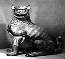 細頭・長頸の阿像の獅子とツノがある吽像の狛犬。神奈川県箱根町芦之湯の弁天さんと呼ばれるお堂の前に鎮座している。胸を張った招魂社系だが、奈良市の手向山八幡宮の国の重要文化財に指定されている木造獅子狛犬の<完全コピー>である。