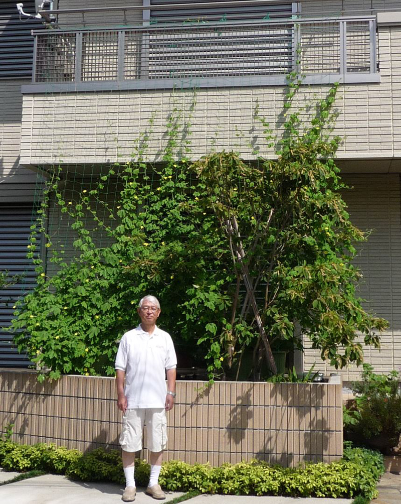 丁度1年前の昨年8月2日にも近況報告で写真をご覧いただきましたが、その写真と比べても 2階ベランダへのせり上がりに勢いがない。左右の拡がりも少なく、グリーンの厚さが不充分で後ろが透けて見えるほど。