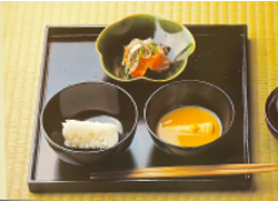 割烹旅館の板場での修行は①野菜や魚を洗い下こしらえする係<洗い方>3年、②魚介類を焼く係<焼き方>3年、③煮物を作る係<煮方>を3年修行して刺し身を捌く板の前に立つ料理人(板前)に昇格していく。和食は「米」を美味しく食べるための<おかず>に旬の野菜、魚介類、海藻など豊かな食材を巧みに調理する技術であり、それを盛る器、食べ方などに日本独特の伝統が育くまれてきたのであろう。父が芸者さんに教えていたもので覚えているのは「懐石料理と会席料理の違い」「懐石料理」の器などに戦国時代の戦場で武将に出された食事に由来するものが多くあることであった。 |
