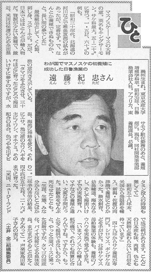 5月19日(日)に恒例となった小田高ホームカミングデーが小田高のキャンパスで開催されました。11期同期会は今年で3回めとなる、同期生を講師とする講演会を開催しました。今年の講師は3組の遠藤紀忠さん(歌手 島田祐子さんの実兄)です。遠藤さんは日魯漁業に入社してから、深く「鮭」に関わり1986年には朝日新聞の「人」欄で紹介されています。(下欄参照)