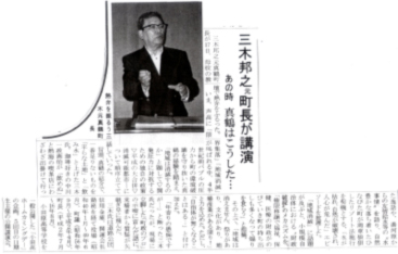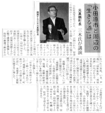 三木氏は道路公団、信用金庫、海運会社勤務を経て役場(昭和40年1月~49年6月)、町議(昭和56年9月~平成2年4月)、町長(平成2年7月~16年8月)。 小田原高等学校キャンパスを一般公開した「小田高ホームカミングデー」の企画。5回目の11期生主催の公開講演。