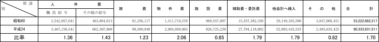 ● 旅費 昭和60年度と比べ1.23倍となっている。民間ではインターネット等を利用した安価なTV会議を導入して極力旅費 を使わない努力をしている。それに習えば23%の削減は可能である。 ● 物件費 昭和60年度と比べ2.06倍となっている。この項目は購入品目の精査を行えば23%の削減は可能である。 ● 補助費・委託費および他会計へ繰り入れ この二つの項目は1.79倍となっている。この倍率からみれば23%の削減は可能である。