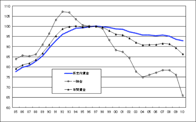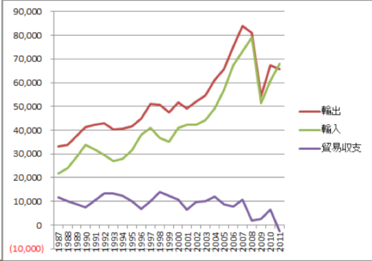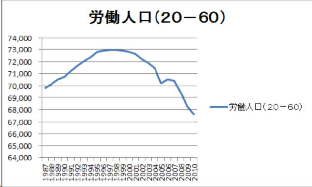 内需縮小の最大の原因は、高齢化に依る購買層の減少にあると考える。20歳- 60歳の労働人口は1998年をピークとして急激に減少しつつある。2010年には1987年よりも二百二十万人少ない6,760万人となった、率にして3%強である。ピーク時に比べれば7%強の減少で、この減少傾向は今後変わらないことを思えば、内需の拡大を望むのは難しい。