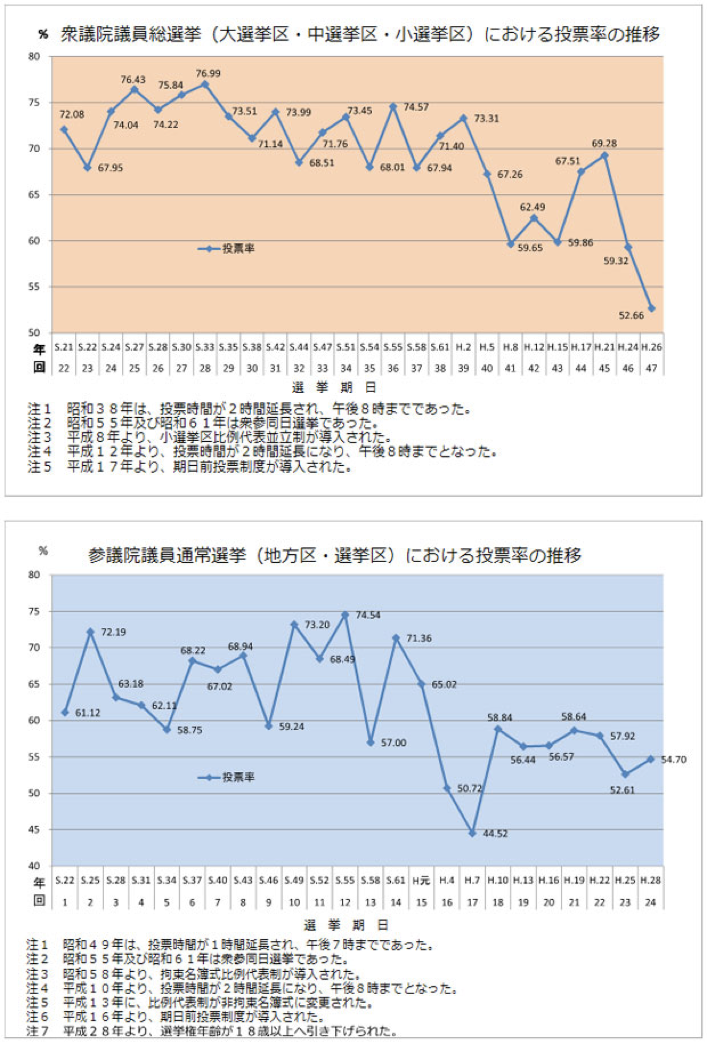 日本国の主人は他でもない我々国民なのだが、その国民が苦労の末にようやく手に入れた「民主」を自らの手で守ろうとしていない。それは投票率の推移に如実に現れている。実に嘆かわしいことだ。 |