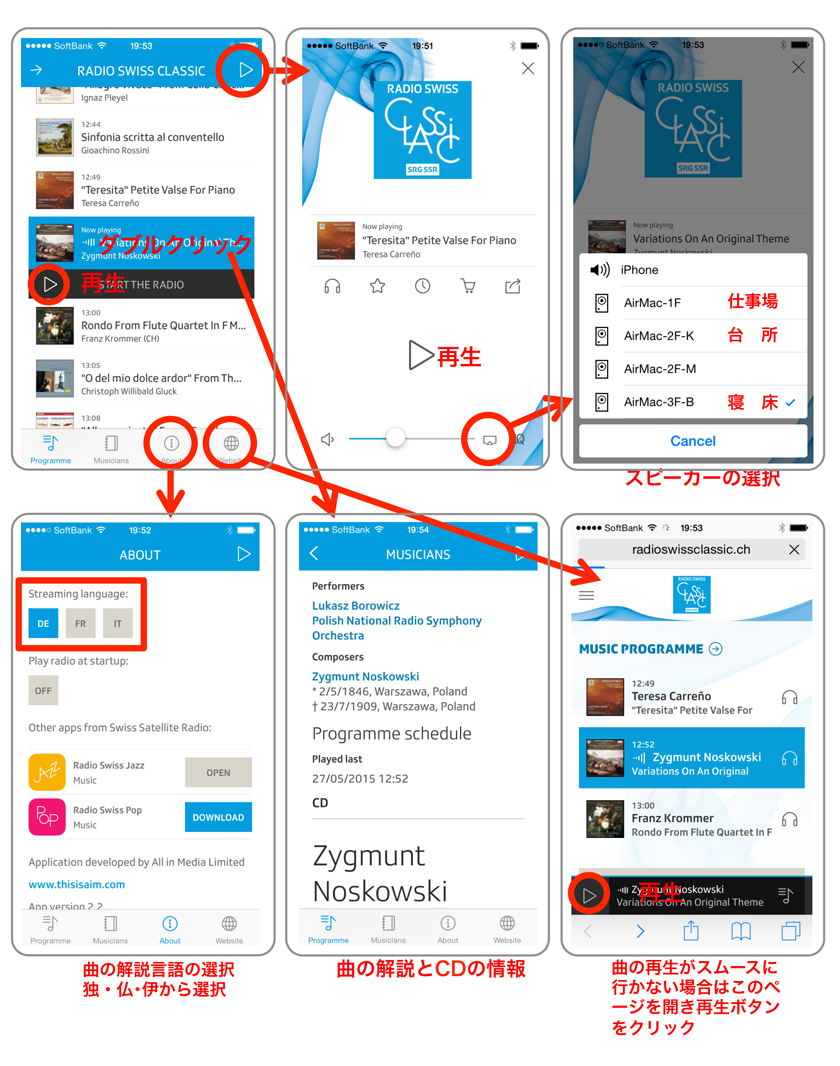ではどのようなアプリケーションが必要なのか。下の写真(iPhoneの画面)のようにRadio Swiss ClassicやRadio Swiss Jazzという無料アプリをダウンロードすればOKである。他にRadio Swiss Popというのもあるが、私には必要無いのでインストールはしない。iPhoneではApp Storeの検索で「Radio Swiss Classic」と入力すれば表示され、無料インストール出来る。音楽サイトは色々あるが、このサイトが一番お薦めである。但し、曲間の解説が煩わしい場合もある。まあ、ドイツ・フランス・イタリア語の勉強だと思えば我慢出来るだろう。 |