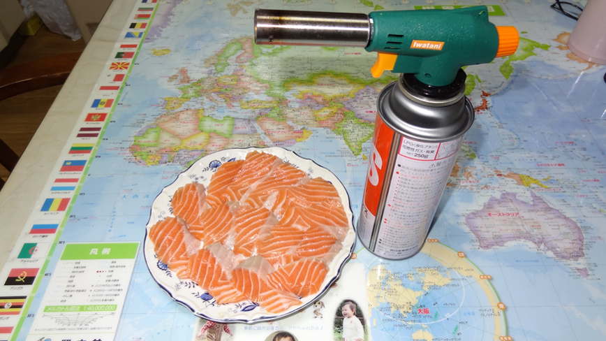 生魚はノルウェー産の油の載ったサーモンをそのまま食べるかバーナーで炙って食べる。そこだけが至福のひとときである。ノルウェー産が無いときはチリ産で我慢するが味と食感は1ランク落ちる。あまりいい加減なことを書くと3組の遠藤さんに怒られるかも知れない。その時はお許しを。