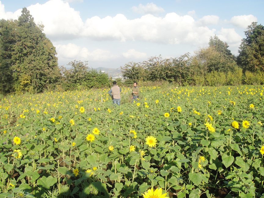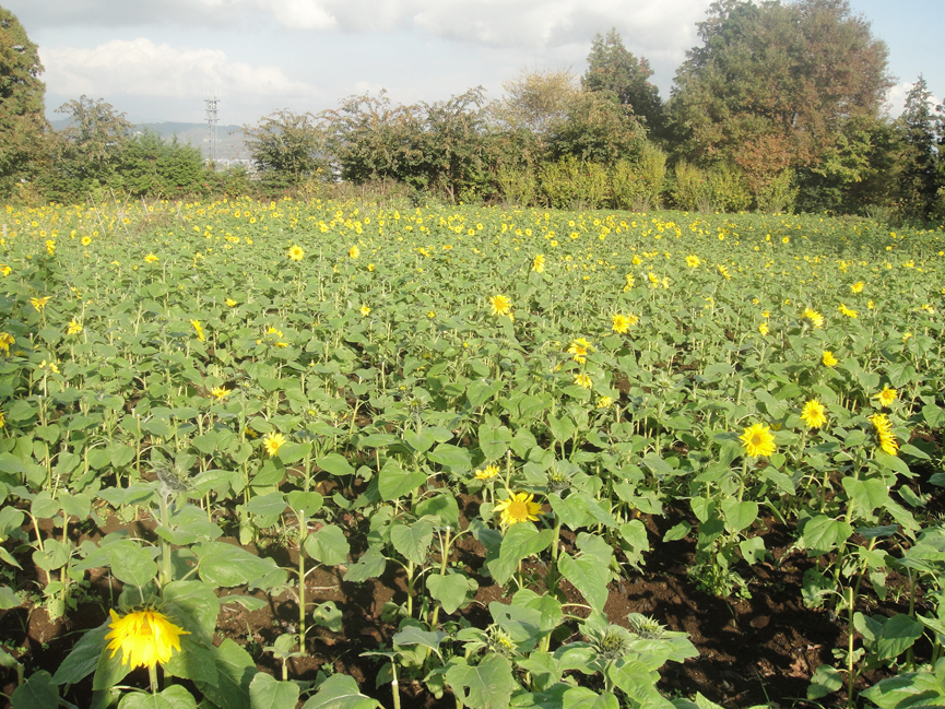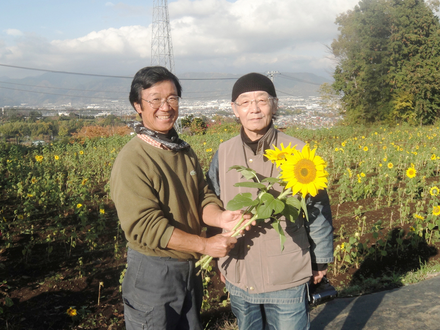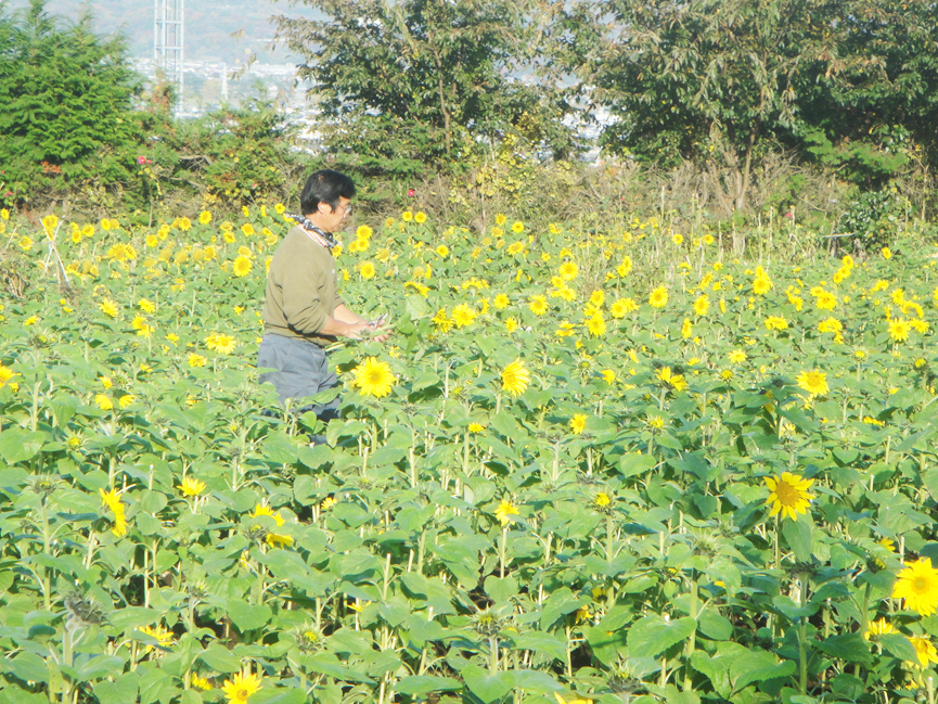 私が時々、古屋さんの畑に足を運ぶのは、遊休農地の利用を広く呼びかけ、こまやかな指導のもとに、一過性でなく地道にしっかりと、それを根付かせようとしており、その経過を見るためでもあります。つまり、びっくり感覚の茶目っ気を心に、全身体を使って、真面目に真面目に農業に取り組んでいるのです。兄(姉)弟の仲も良いですよ。ひまわりの切り花販売についてこんなエピソードがあります。当初、「2本100円」を考えていた古屋さんに、お兄さんから「高い。3本100円に----」と言われて、この値段になりました。もちろん、2本100円でも十分安いのですが、こんな兄弟の交流がひまわり畑に息づいているのです。