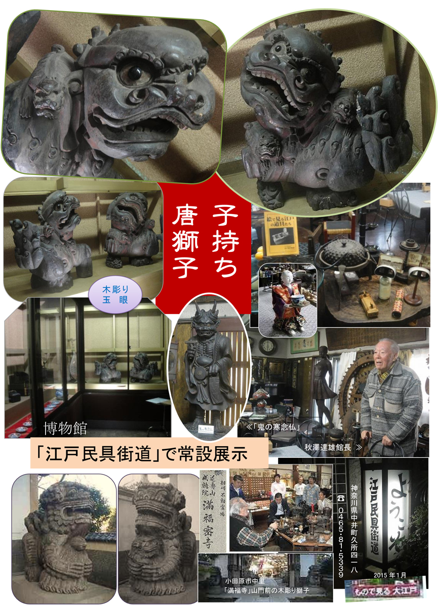 木彫りで真っ黒。そして玉眼。このユニークな姿を、一見して、なんと表現してよいやら----。一対の「子持ち唐獅子」。博物館「江戸民具街道」(秋澤達雄館長、神奈川県中井町)にある----。趣味の会「日本参道狛犬研究会」(三遊亭円丈会長)に所属する私の狛犬探訪の一コマです。この親子獅子は、これまで収蔵庫に保管されていたが、このほど、常設展示された。私は以前からこの獅子に関心があったが詳しいデータが分からない。そこで、一般公開を機会に紹介して、皆さんからの情報を求めるしだいです。