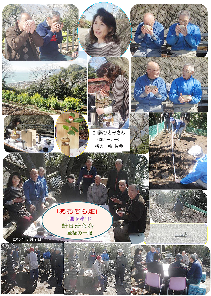 | 夜来の雨がすっかりあがった3月2日午前、「あおぞら畑」で<野良着茶会>が行われました。あおぞら畑は、小田原市国府津の保育園児たちの情操教育の場で、JR東海道線・御殿場線「国府津駅」北側の国府津山にあります。耕作放置されたみかん畑をオーナーが保育園に無償で貸与し、地域住民がボランティアによる「協力会」を結成して整備し、今年で3年目を迎えます。
