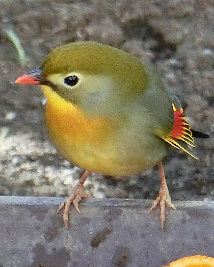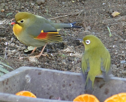 ソウシチョウ----スズメと同じくらいの体長14~15cmほどの野鳥。嘴(くちばし)が真っ赤で、目はつぶらな黒、体はウグイス色で翼には黄色や赤い縞模様がある。つがいのオスとメスを分けてしまうとお互いに鳴き交わしをするため「相思鳥」の名前が付いたと言われる。もともとは中国にいる鳥で姿が美しく鳴き声も良いため中国ではポピュラーな飼い鳥らしい。日本にいるのは中華街での飼い鳥が放鳥・カゴ抜けしたものと言われる。