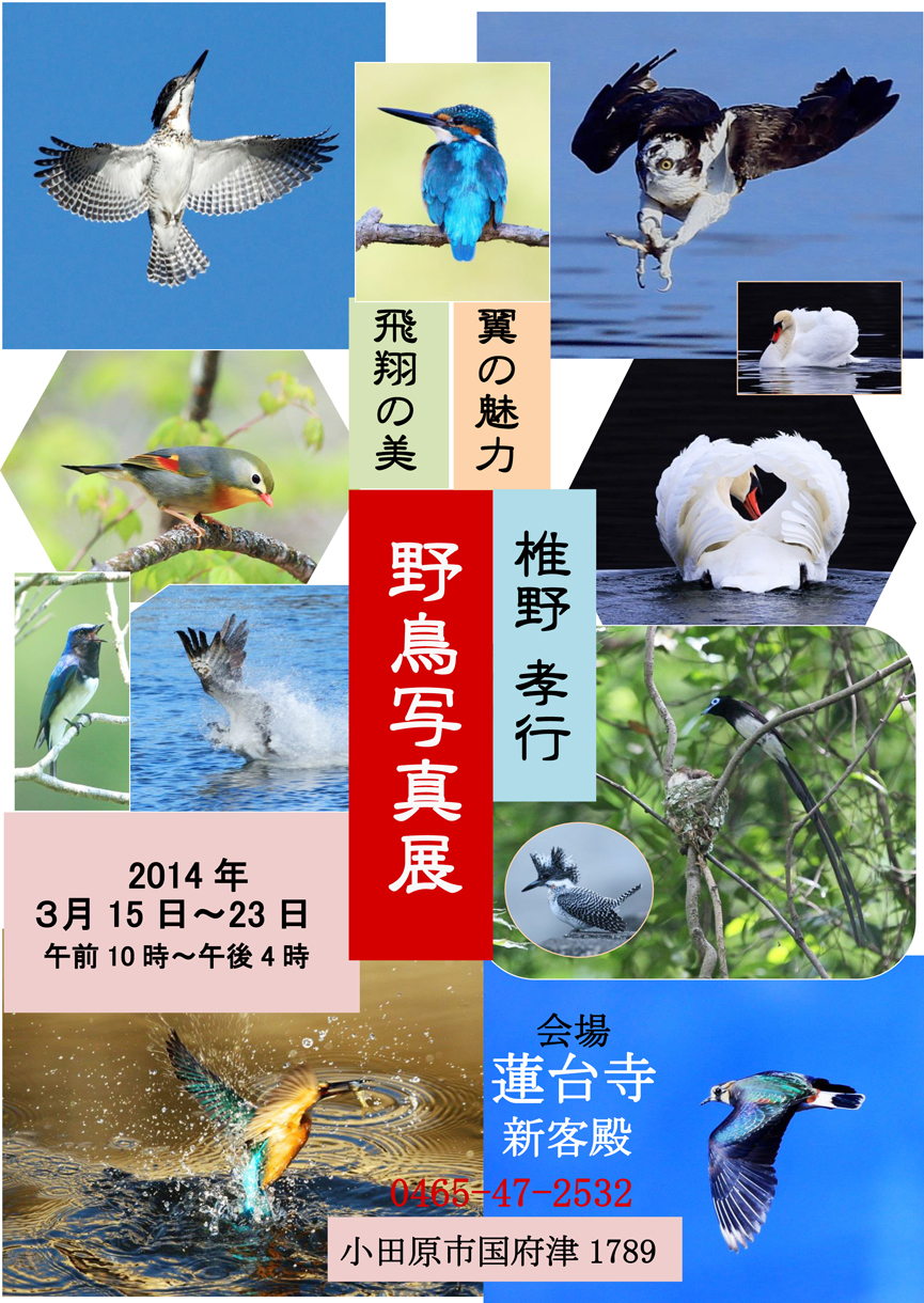 なお、ソウシチョウのことを教えてくれた友人は、一年前に「野鳥写真展」を開いた。その一瞬をとらえた様々な飛翔の姿は実に見応えがあり、評判を呼んだ。写真の主は神奈川県二宮町在住の椎野孝行さん。その時に、私が作らせてもらったポスターを改めてここに紹介します----。
