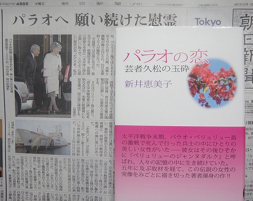 2014年9月15日に米軍の上陸開始70年の記念式典が開かれ、約300人が参列した。「日本人の参列者は30人足らず。ちょっと寂しい気がした」。『パラオの恋~芸者久松の玉砕~』(北辰堂出版)の著者・新井恵美子さん(76)の話だ。神社にはアメリカ人からの献花もあった。彼女は2度目の訪島。「今、何に焦点をしぼって書くか」思案中だそうだ。