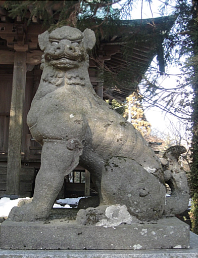 「頭頂中央に一角、顔をほぼ右真横に向け、瞋目・閉口し、右前肢をわずかに出して蹲踞する。盛り上がった筋肉や強く踏ん張った四肢は力強く、的確かつ生気ある写実的表現にまとめられている。細頭・長頸表現はこの時期の狛犬としては異例----」。文化庁の重文指定の記述。木造を石造に変えれば、この文言は芦之湯の狛犬にぴったりだ。八幡宮の本殿に現在ある獅子狛犬は江戸時代の一対である。狛犬に限らず、<完全コピー>は独創性の対極にある。材料が違えば、職人の技量が一層試される。