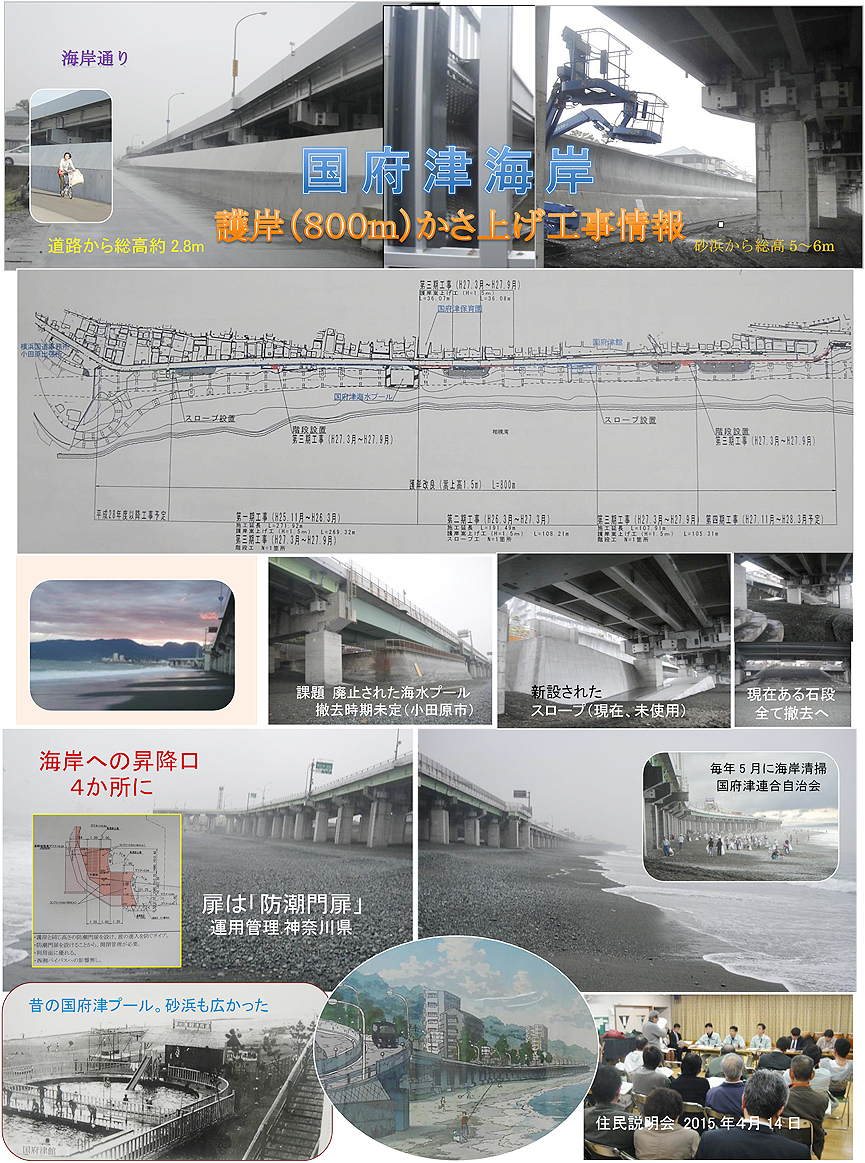 護岸かさ上げ工事に伴い、海岸通りから浜辺へ降りる石段等は全て撤去されます。昨年廃止された海水プール(管理・小田原市)も撤去されますが、まだ具体的期日は決まっていません。護岸の一部は、閉鎖された降り口の扉が板で簡易設置されたままです。予算の問題もありますが、県は、平成28年3月までにはなんとか工事を終えたいと話していました。