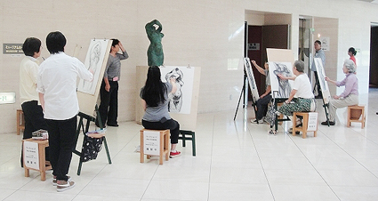 河口氏の大津絵は、テレビや新聞などマスコミで何回も紹介され、個展回数も多いため、河口氏の名前を知っている人は多いと思う。私も何回か河口作品を目にしているが、もちろん今回のような作品群に囲まれたのは初めて。私が訪れたのは最終日の7日の午後3時過ぎ。受付によると、6日間の入場者は1000人を超えているという。「美術館の企画展の内容によって客足が左右されるんです」とは河口氏。ちなみに期間中の企画展(入場有料)は、「京都市美術館名品展 美人画の100年」(4月25日~6月7日)と、「川口起美雄 ~絵画の錬金術師」(4月18日~6月14日)の二本立て。この日は「美人画展」の最終日でもあり、また、絵画愛好会のメンバーによる、美術館所属彫刻作品をデッサンするワークショップも行われており、客足は途切れなかったようだ。