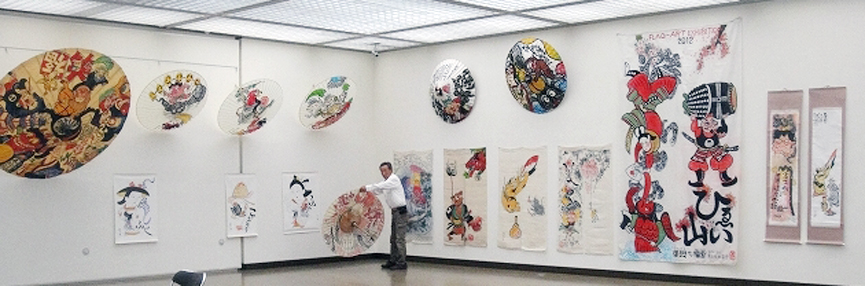 「えっ、今日が最終日----」と、あわてて展覧会場に向かう日々が最近多い。平塚市美術館市民アートギャラリーで開かれた「大津絵 番傘アート展」(6月2日~7日=入場無料 平塚美術館 市民アートギャラリーにて)もその一つ。庶民絵画、風刺画、あるいは世相画ともいえる大津絵は、私の心を打つモノがあり、観ていて見飽きない。直径2mの番傘や長さ10m近いロール紙はじめ大小の番傘、色紙などに描かれた展示作品はざっと70点。大津絵師の河口邦山(かわぐち・くにさん)氏(75歳)=神奈川県大磯町在住=によると、これまでの最大規模の展示会という。