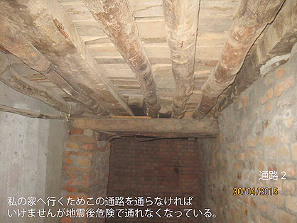 私は今住んでいる家から大通りまで出るため2箇所の通路を通らなければいけませんが、地震の揺れを見ていたら、その時家を出れば誰も生きたまま安全な所まで移動出来る可能性もないと思い家の3階で地震が終わるまで待っていました。地震後、お蔭様で家は無事でお互いに協力し合い無事安全な所まで移動出来ました。そして周りの人も無事でしたが、家は住めなってしまったのは残念です。私の家はもちろんひびが入りましたが、建築家に見てもらったら住むのに安全と判断してくれました。だが、残念ながら家まで行くのに通らなければいけない2箇所通路の上の家2件が何時倒れてもおかしくない状態になってしまい、家まで入れなくなってしまい、私たちは別の所に引っ越しました。前のところから約2.5キロぐらい離れてところですが、初めて自分が生まれたところを離れていきましたので慣れるのに少し時間がかかると思います。