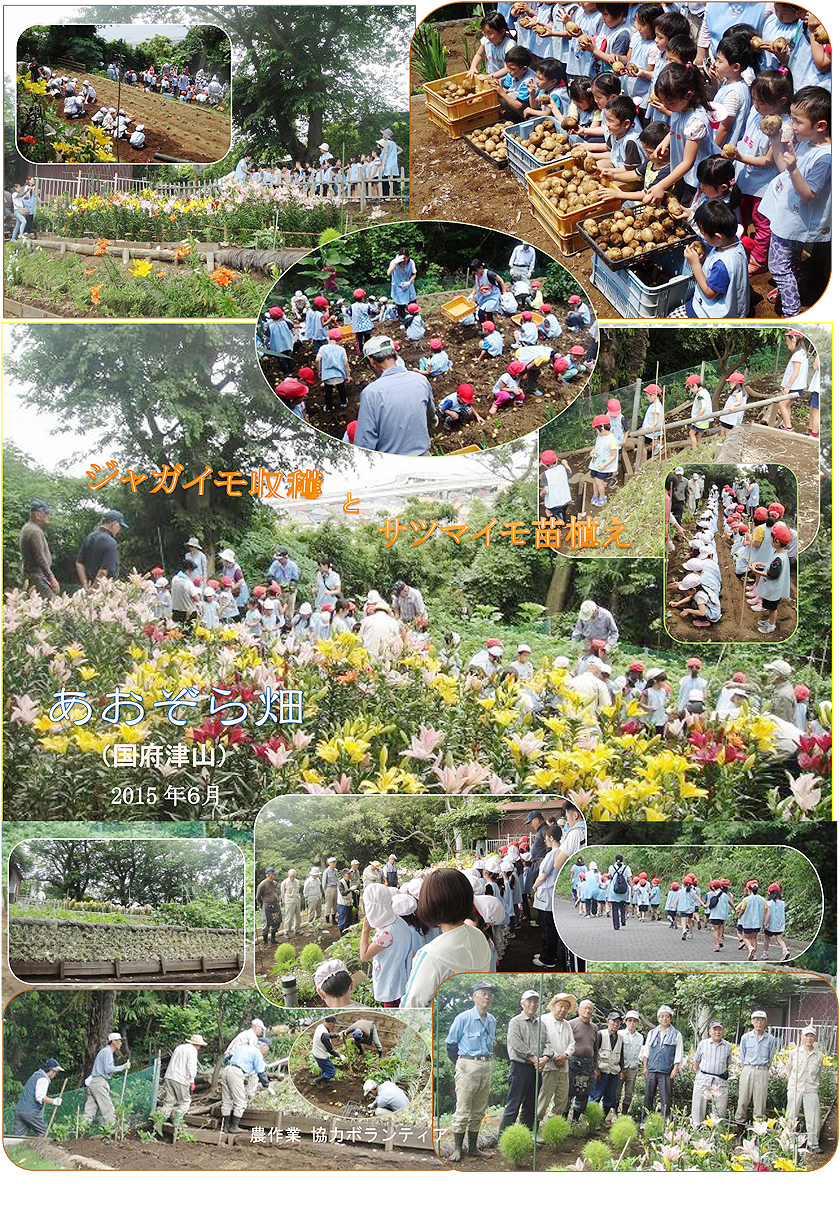梅雨の合間の5日(金)にサツマイモの苗植えを行い、17日(水)にジャガイモを収穫した。JR東海道・御殿場線「国府津駅」北側の国府津山の農道沿いにある子ども農園「あおぞら畑」(神奈川県小田原市国府津)。二つの保育園児約60人。農作業はそれぞれ午前10時から始まった。サツマイモの苗は一人2本。子ども農園協力ボランテアの見守る中、段々畑4枚の内の2枚を移動しながら1本ずつ、丁寧に土をかぶせた。ジャガイモの収穫は、逆に、土から引っ張り出して、その一個々々を目にするたびに、子どもたちは歓声をあげ、手にしたジャガイモを天に向けていた。