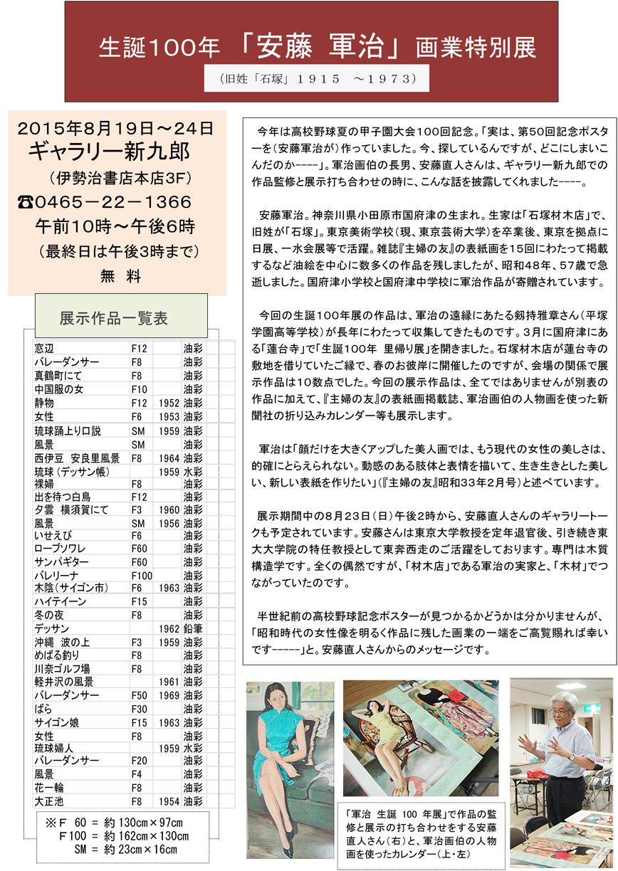 今回の生誕100年展の作品は、軍治の遠縁にあたる剱持雅章さん(平塚学園高等学校)が長年にわたって収集してきたものです。3月に国府津にある「蓮台寺」で「生誕100年 里帰り展」を開きました。石塚材木店が蓮台寺の敷地を借りていたご縁で、春のお彼岸に行ったのですが、会場の関係で展示作品は10数点でした。今回の展示作品は別表の作品に加えて、『主婦の友』の表紙掲載誌、軍治画伯の人物画を使った新聞社の折り込みカレンダー等も展示します。