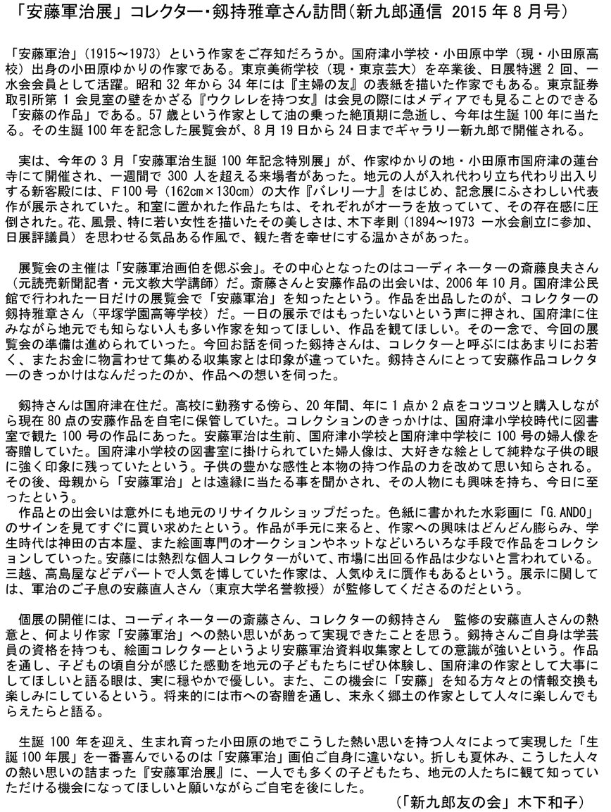 「高校野球の第50回記念ポスターは(安藤軍治の)作品なのです。今、探しているんですが、どこにしまいこんだのか----」。軍治画伯の長男、安藤直人さんは、ギャラリー新九郎での作品監修と展示打ち合わせの時に、こんな話を披露してくれました----。