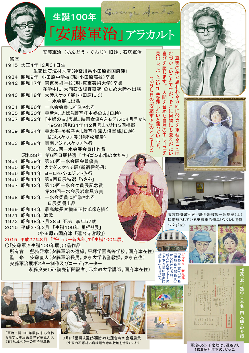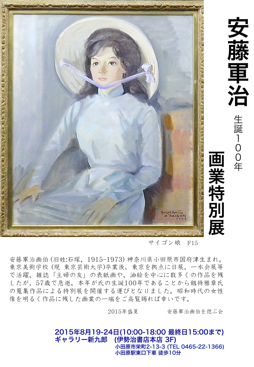 安藤軍治。神奈川県小田原市国府津の生まれ。生家は「石塚材木店」で、旧姓が「石塚」。東京美術学校(現、東京芸術大学)を突業後、東京を拠点に日展、一水会展等で活躍。雑誌『主婦の友』の表紙画を15回にわたって掲載するなど油絵を中心に数多くの作品を残しましたが、昭和48年、57歳で急逝しました。