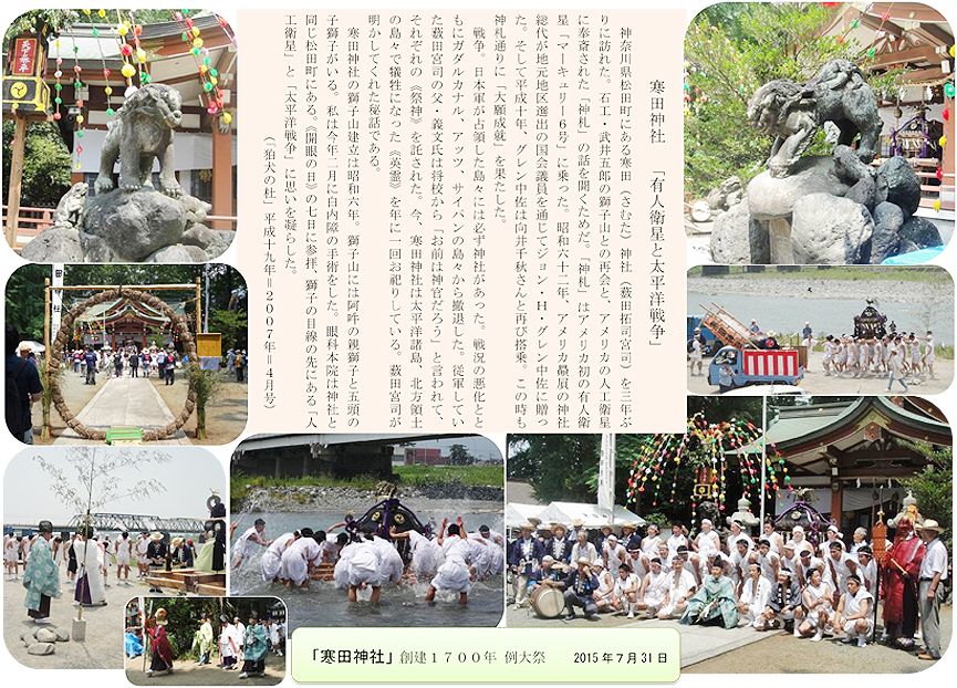戦後70年。国会での安全保障関連法案の審議、70年の安倍首相談話の行方も加わって、今年の夏の新聞やテレビは、ドラマを含めて連日のように大戦に絡む報道が続いている。狛犬探訪の「余話」三題を、写真を交えてまとめてみました。 |