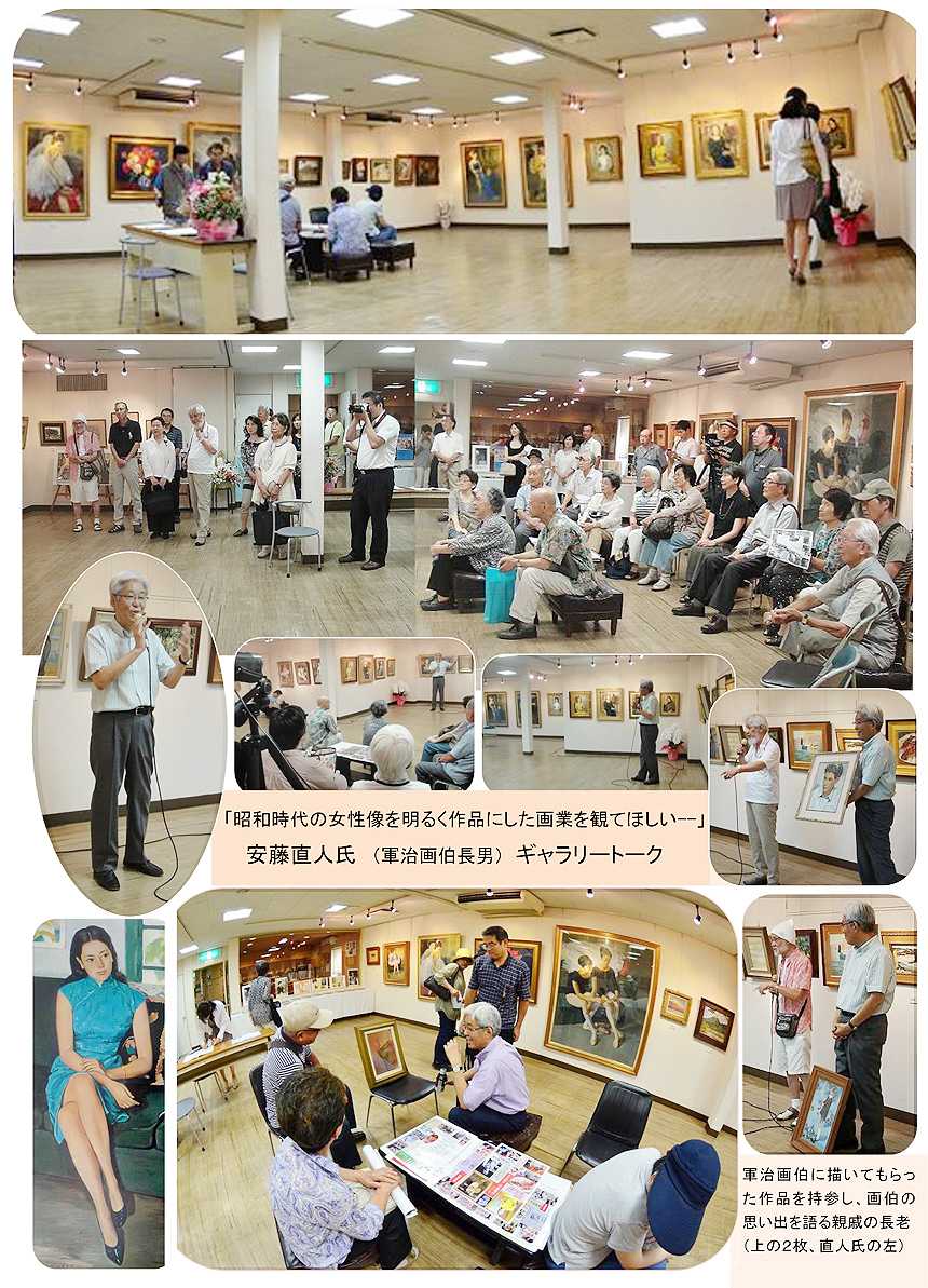 展示された作品は軍治の遠縁にあたる剱持雅章さん(学校法人「平塚学園」)が30年間に渡って収集したものです。会期中の8月23日(日)午後、画伯の長男、安藤直人さん(東京大学名誉教授)のギャラリートークが行われました。安藤さんの専門は「木質構造学」。全くの偶然ですが父の生家の「材木店」と<木材>でつながっていたのです。そんなエピソードを交えながら父親像と作品を解説。「実は、美校への入学は彫刻でした。絵の具が買えなかったからです。(遺品の)スケッチブックなどをみると、小さい頃から教師や友達の似顔絵を描いていました。それだけ、画が好きだったのです」「父の画は、モデルの顔が写真のように似ている『肖像画』ではなく、モデルに似ている似ていないではなくモデルを幅広く立体的にとらえた『人物画』と言えます。そして、戦後の昭和の時代にあって女性を明るく描き、画そのものも大変素直に描いています」。
