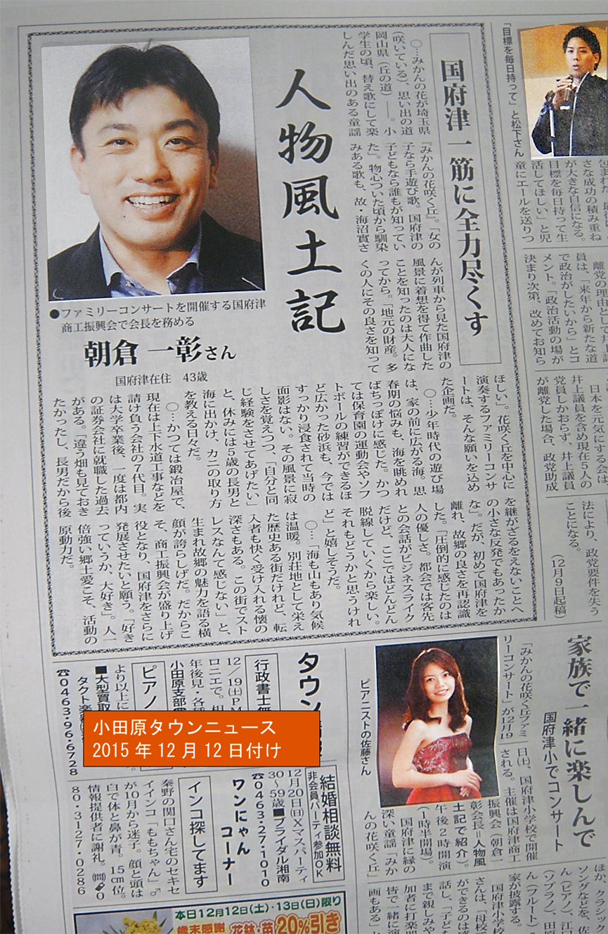 小田原市国府津商工振興会(朝倉一彰会長)は、12月19日(土)午後2時から小田原市立国府津小学校体育館で「みかんの花咲く丘ファミリーコンサート」と題したコンサートを開きます。