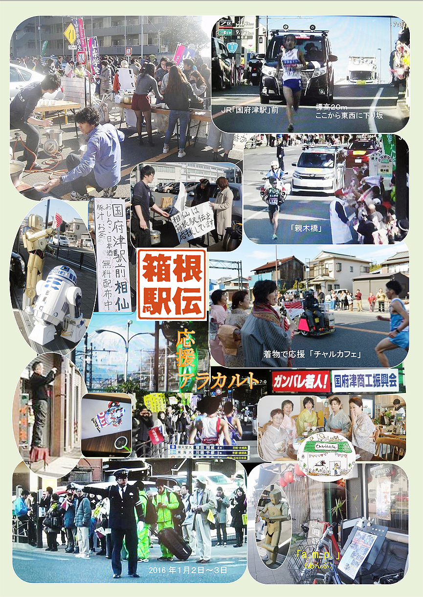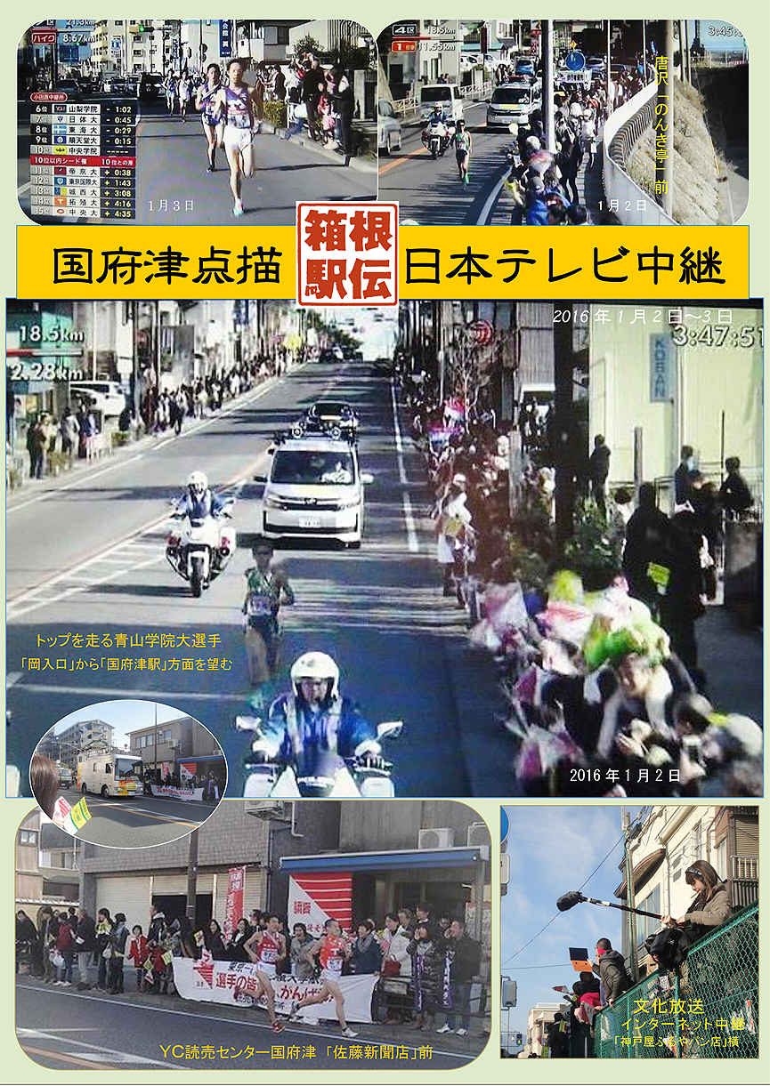 今年もまた日本テレビで国府津の街並みが中継されました----。正月の2日~3日に行われた「箱根駅伝」(第92回東京箱根間往復大学駅伝競走)の雑観写真です。
