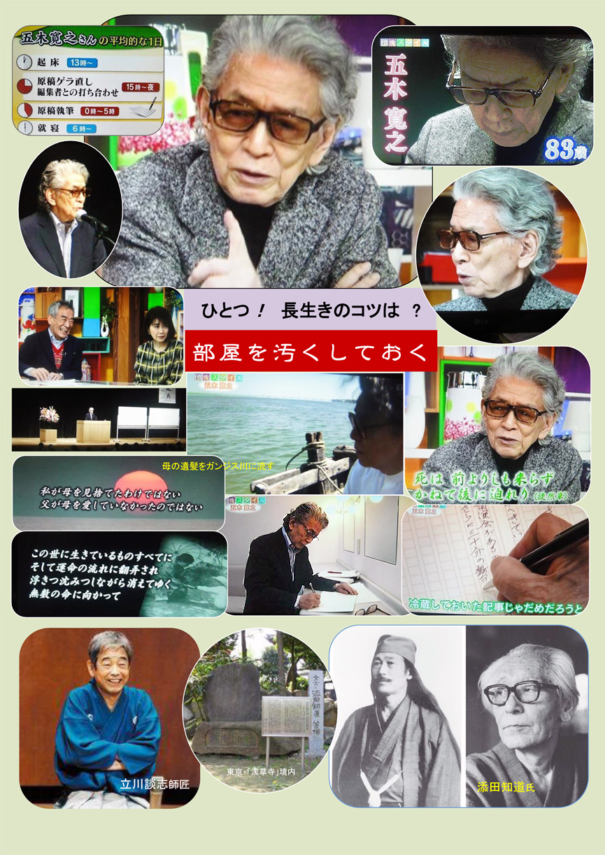 「部屋を汚くしておく」「アレを見られちゃ大変だから、片付けるまで死ねない」----NHK・Eテレの番組「団塊スタイル」(2016年1月29日放送)の中で、作家の五木寛之氏(83歳)は、長生きのコツについてこう話していた。視聴者からの「何歳まで生きたいですか」という質問に、「世の中の移り変わりを、一年でも長く見ておきたいという気持ちはある」と、具体的な数値はあげずにこう答えたあと、間をあけるまでもなく、心持、身を乗り出すように語った。