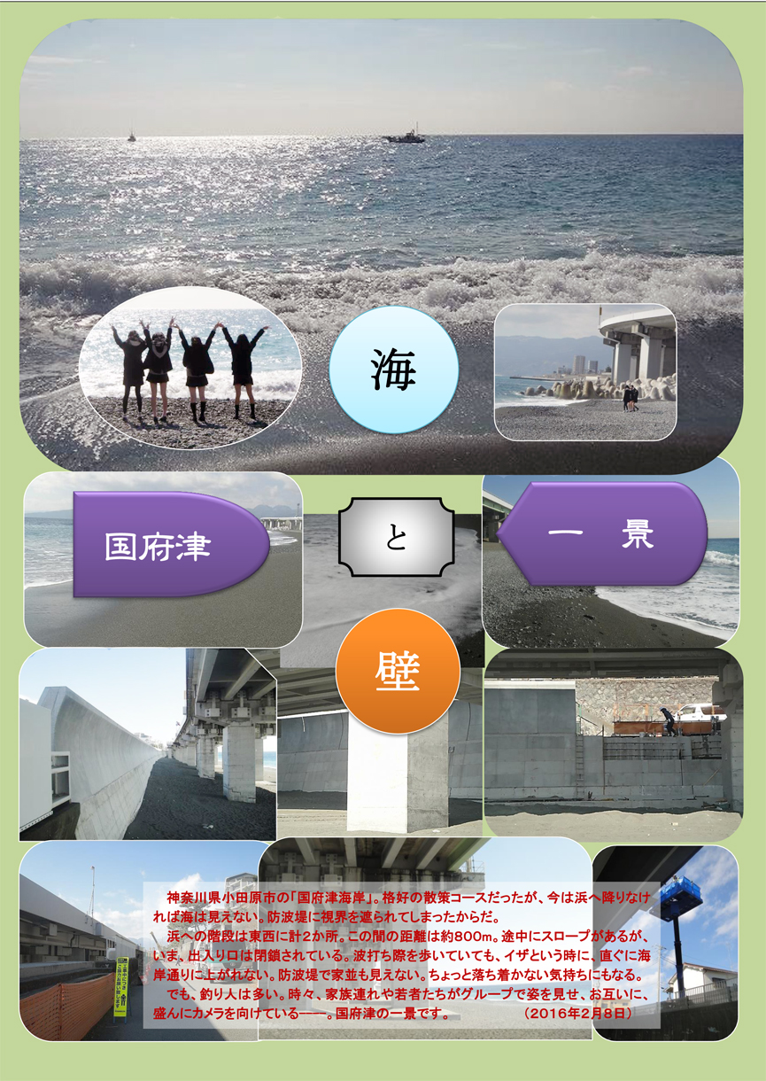 自宅からゆっくり歩いて15分足らずで「海岸通り」に着く。海景色を楽しめ、散策する人が多かった。多かったと言うのは、今は歩く人がほとんどおらず、国道一号線を迂回する車がやたらと目立つばかり。防波堤が海を目隠ししてしまったからだ。浜へ降りても階段周辺に座って海を眺める人が大半で、波打ち際を歩く人も、また、少ない。階段が海岸通りに東西2つだけ。この2つの距離はざっと800mあって、途中で海岸通りに戻る階段がないからだ。波打ち際を移動するのは釣り人だけと言っても過言ではない。