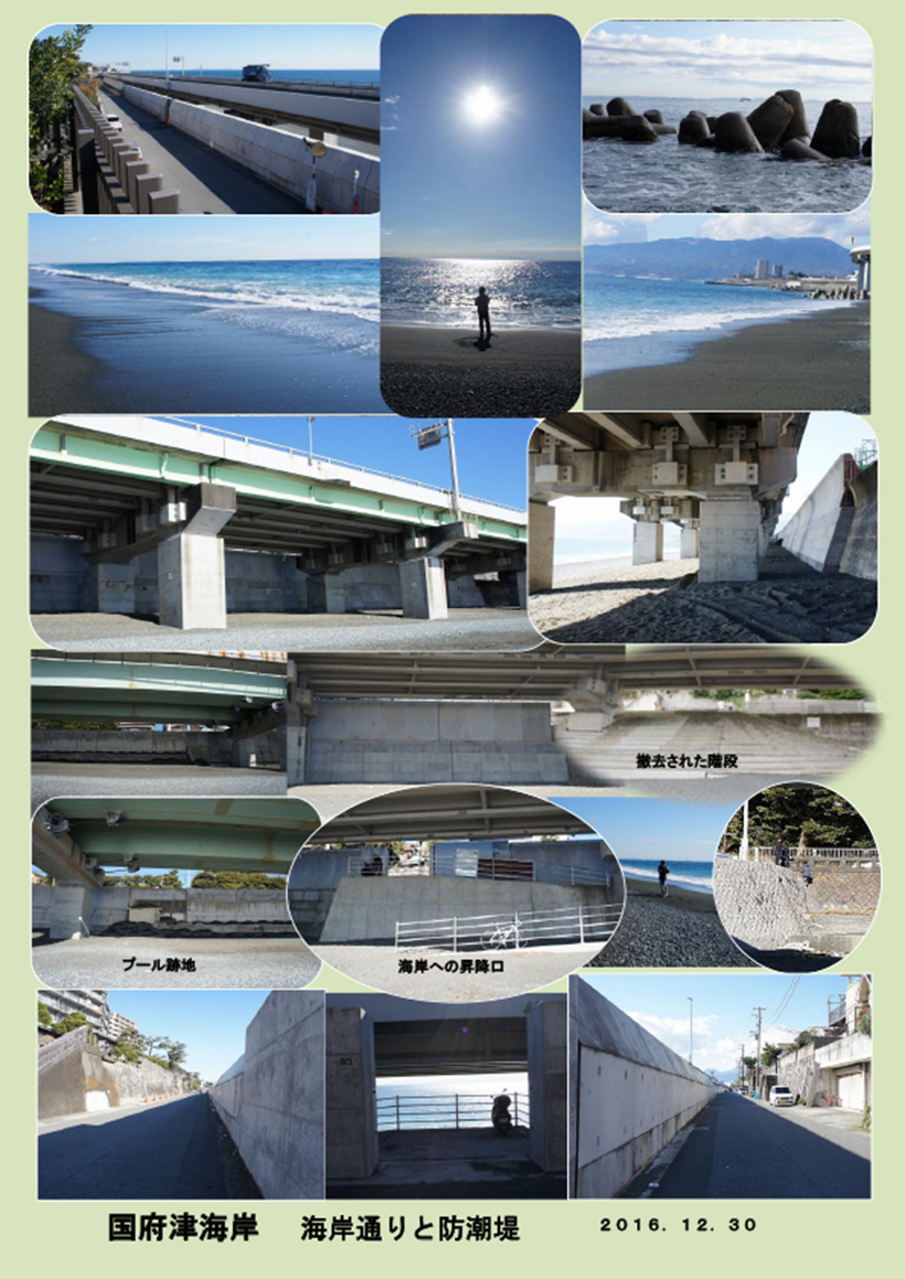 国府津海岸の防潮堤。海岸通りから3m近くのかさ上げ工事。全長約800m。ほぼ工事は終わっていた。12月30日午前、一か月余ぶりに海岸を歩いた。旧来の幅広い階段は撤去され工事機材の姿も無かった。波打ち際から海岸通りを見ると一面の「壁」。海岸上を走る西湘バイパスと相まって、民家も国府津山も見えない。