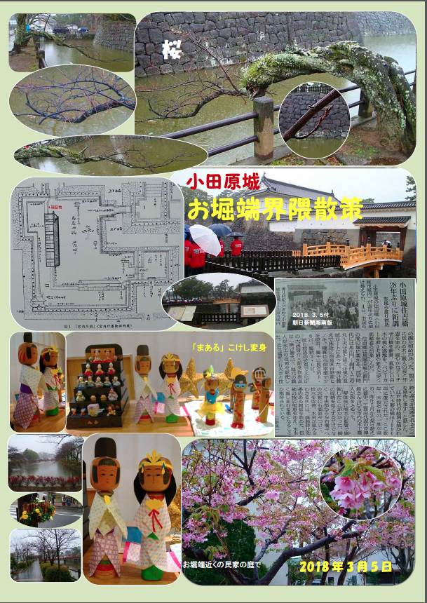 3月5日の桜の状況等をアルバムにしました。小田原城址公園内の架け替えられた「住吉橋」、お堀端に近い民家の庭に咲く満開の桜も写真に収めました。「変身こけし」は社会福祉施設「ほうあん地域支援センター『まある』」のものです。「まある」はスペイン語の「mar(マール)」で「海」の意味です。一般の人もお茶や食事ができるところで、私は時々立ち寄っています。こけしは友人が寄贈したものです。そのこけしを使ってスタッフが子どもたちと一緒に折々の話題や季節の行事に合わせて変身させています。「変身こけし」を見るのも楽しみの一つです----。