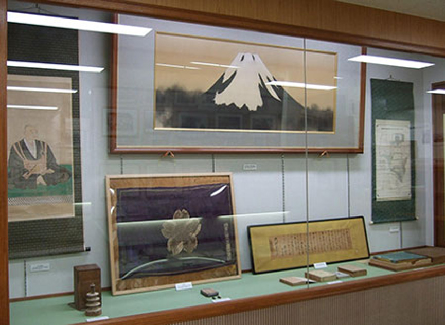 しかし、なんとしても同窓生諸兄にこの作品の“スゴサ加減”をお知らせしなければ。そのためにはインターネットにすがるしかありません。そこで早速インターネットに“お伺いをたてた”ところ、僅かに小田原高校同窓会「樫友会」のホームページだけに(http://odako.org/web/about/cat34/post.html)に「校宝」として右のような写真が載せられていることが分かりました。ガラス越しに上部に映っているのが「初秋黎明の富嶽」ですが、格調の高い構図や大胆な色遣いから漂い出てくる作品のスゴサをお分かり頂けるでしょうか。