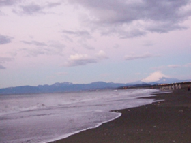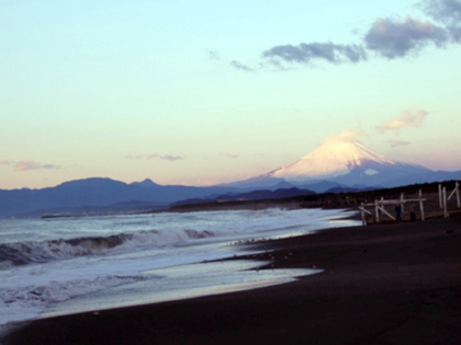 “湘南の中央”辻堂海岸は、あいにくの曇天のため初日の出詣での人出も例年の1/4程度で、海岸に着いた時には日の出が見られるはずの江の島側の空には暗雲が垂れ込めていました(上段左)。しかし、目を転ずると南側には伊豆大島が茜色の空を背に浮かんでおり(上段中央)、更に、西には丹青の空を背に富士山と伊豆半島の姿を遠望することができました(上段右)。これは「日の進む方向につれて、つまり、“年末に向かうほど展望が良くなる”という予兆なのかな」それとも「“苦境にあるときは目を転じてみよ”という教えなのかな」と思いながら暫くして再び視線を東に戻してみると、僅かな雲の隙間をこじ開けるようにして初日が顔をのぞかせてくれました(下段左)。飽食の時代にあってふんだんに与えられていることに対して感謝することを忘れがちな私にとっては、ささやかなものでも与えられることに感謝することの大切さを実感できるひと時でした。そして、再び振り返ってみた富士山の頂には背景の空の丹青が鮮やかさを増すなかで既に陽光が届いているのが見えました(下段右)。東側で懸命に顔をのぞかせる太陽の光が富士山頂に達している姿を見てなんとなく「至誠天に通ず」と一脈通ずるような感懐を覚えました。
