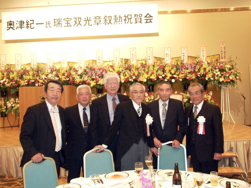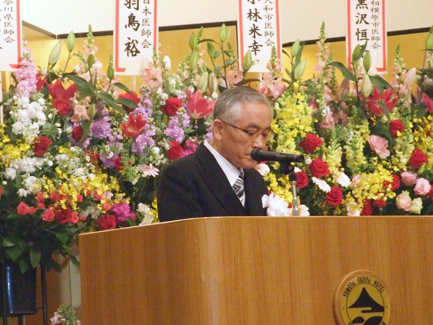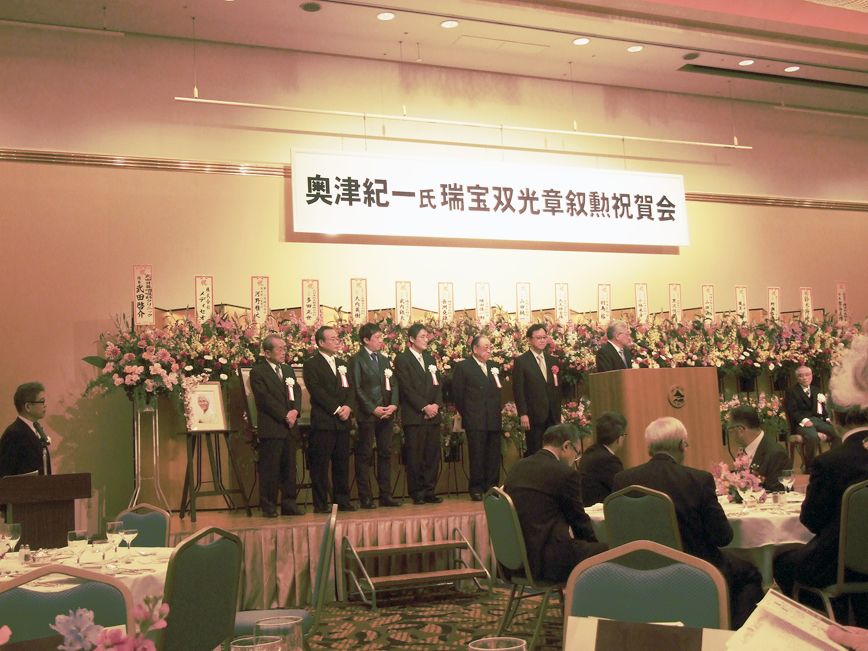ステージに上がる際に奥津君の足元がふらついていたので、“非先生”一同「オヤオヤ」と心配していたのですが、引き続く受章者挨拶(下の写真)の中で奥津君が、ユーモアを交えて「父親の跡を継いで1972年に奥津医院を開設するのと一緒に糖尿病も引き継いでしまった」と話されたので一同合点がいきました。