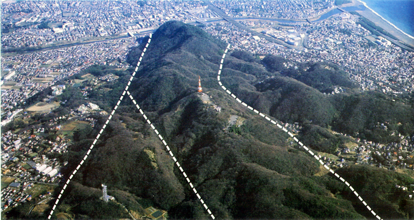 隆起する丘陵地と沈下する平野との境には当然「断層」が発生します。実際に「湘南平」の周辺には大小の断層が錯綜した形で走っています。下の写真は、平塚市博物館2007年刊行の「平塚周辺の地盤と活断層」に載っている「上空から湘南平の東西性の活断層を望む」というタイトルの写真ですが、左から順に小向断層、千畳敷中央断層、千畳敷断層が点線で示されています。断層のうち、将来も活動する可能性があるものが「活断層」と呼ばれていて、1,000年に1m以上の割合で隆起を繰り返しているものは活動度Aにランクされていますが、小向断層はA級の活断層と認定されているそうです。丘陵地と平地を鋭く隔てているような様子を写真からも見て取ることができ、小向断層がA級であることが納得できるような気がします。 |