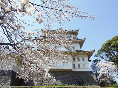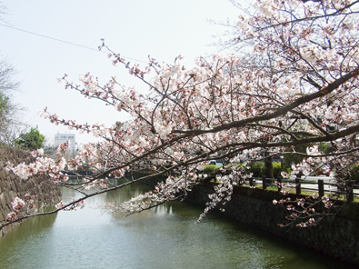 天守閣は耐震工事を行なうため来年(2016年)の4月末まで“入城”禁止になるのだとか。しかし、幸運なことに今日は入館禁止直前だったので、オーストラリア人に古城の内側まで見せてあげることができました。館内の展示物を興味深く見入っている二人に、「ねえ、ここからも桜が見えるよ」と誘って窓外に目を向けさせ(右の写真)、「ほら、やっぱり城と桜の取り合わせは良いでしょ」とここでまた更に一言追加。