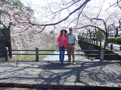 しかし、桜は満開になってから散るのも早いですが、咲き始めてから満開になるのも随分早いものですね。ようやく「蕾膨らむ」の花の便りが聞こえたかと思うと、急転直下「明日小田原地区満開」の報になってしまうのですから。そこで、得たりやおう応と、3/30にホンダN Wagonで小田原に駆け付けた私たちをお堀端の桜は温かく迎え美しい姿を見せてくれました(下左の写真)。生まれて初めて、身を本物の満開の桜の元に置くオーストラリア人の喜びの表情も併せてお読み取りください(下右の写真)。なかなか咲いてくれずヤキモキさせてくれたのですが、小田原の桜は見事に“日豪親善大使”の役割を果たしてくれたのです。