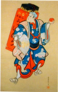 | ところで、外郎武社長からいただいたお名刺には右のような絵が描かれています。江戸時代に、二代目市川団十郎が、咳と啖の病で台詞が言えず舞台に立てなくなって困っていた時に、「ういろう」を知り服用したところ全快したのに感激して、小田原までお礼に訪れたことに端を発しているのだそうです。外郎家では「宣伝になってしまうから」と固辞したものを、「是非こういう薬が世にあることを知らせたい」という団十郎の強い熱意があったため生まれ引き継がれてきたのが歌舞伎十八番の「外郎売り」で、爾来、代々の市川団十郎が小田原の「ういろう」を訪れてきているとのことです。「別世界の“伝統を守ろう”とする者同士が交流を続けてこられているのはうれしいことです」と語られる外郎武社長のお言葉が身にしみて分かるような気がしました。因みに外郎家では一度も薬を売り歩いたことがないそうです。