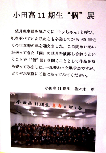 ずっと以前に人口が23万人だった頃に町田市が市民の“心と心をつなぐ”「23万人の個展」を開いていました。出展物は何でもよく、中にはドモリに悩む人が、「上手にドモリの真似をするコンテスト」の小間を開いて楽しむといった個展もあったそうです。同じ小田高11期生とはいえ、他のクラスのメンバーとは全く無縁の場合が多く、同じクラスであっても‟個‟の部分はよくは分かり合えていない「知っていそうで知らない」者同士です。お堀端通りの「音羽」にて「小田高11期生喜寿を祝う会」を開くに当たって、11期同期生の“心と心をつなぐ”ための有効な手段として導入したのが「個‟展」でした。