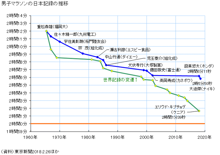 次の表は男子マラソン日本記録を世界記録の変遷と対比しながら表示したものです。1960年のローマオリンピックに“はだしのアベベ”(エチオピア)が出現して以来、世界のマラソン界はすっかり様変わりになりました。アフリカ人の潜在的なマラソン競技力が顕在化され、世界記録がアフリカ人ペースで次々と更新され、2002年以降更新されていなかった日本記録との格差は開く一方です。明らかにDNA因子の格差によって、「日本がマラソン王国として復帰できない」状態が出来上がっているところに、子供だましにも似た「1億円ご褒美作戦」で臨んだ日本陸連幹部の指導力の低さが如実に表れているように思えます。いつまでも過去の栄光にとらわれている(すなわち“既成概念の打破”ができていない)日本陸連がらみの指導者達は自らの指導力の低さを自覚して身を引いて、「遅咲きの大器」の成長を助成した青山学院大学の原貢監督や「腹筋女王」を見事開花させたダイハツの林清司監督などに指導者の席を譲るべきではないかと思います。