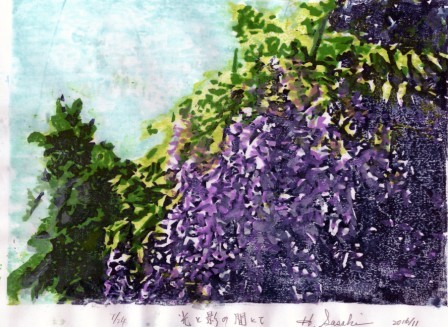 「藤○」姓の藤井暉生兄(7組:通称テルさん)が急に逝去されたのは私にとって大きなショックでした。藤の花と同じく「出過ぎることも退き過ぎることもなく立場所にいながらしっかりとした存在感を示してくれていた」テルさんを偲びながら2018年カレンダー用に作成したのが以下の木版画でした。相変わらずの下手っぴな出来ばえですが、藤井暉生兄生前の姿と重ね合わせて見ていただける方がおられたら幸いです。 |