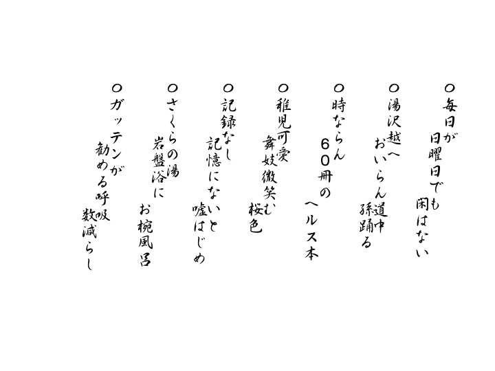 先ずは身体作りからと健康本60冊をおさらい中で、4月号NHK俳句を初買いし、孫が住む新潟県燕市の分水桜まつりから帰ったところです。575をご笑納下されば幸いです。