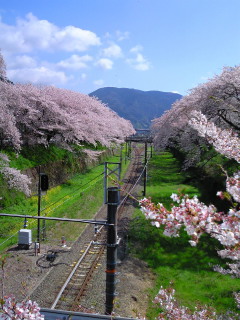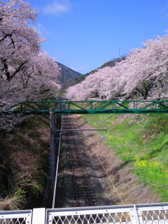 今日、山北へ行きましたが、桜が満開で、谷峨へ向かう線路沿いの土手の花のトンネルが見事でした。夕方川崎の家へ帰ったら、妻から、昼間テレビでも「山北の桜」を映していたと聞きました。陸橋から携帯で撮った写真を送ります。谷峨方向と駅方向です。