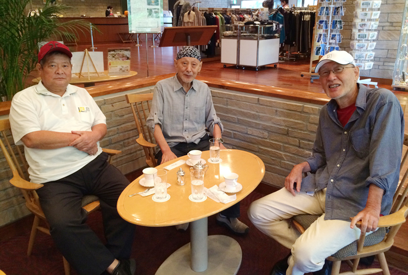 3時20分、ようやくご到着。スポーツカータイプの車にバンダナがよく似合う。でも降りて歩くとよぼよぼジーさん。米山は至極元気そう。相変らず太ってはいる。 久し振りで顔を見たら、イライラも吹っ飛ぶ。