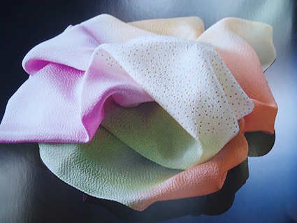 写真の正絹の風呂敷の“枡取ぼかし”という四隅に異なる色が配され、絹の滑らかさが一段と表現される。