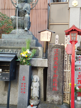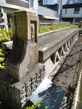 次に、江戸通りを西に新常盤橋に向かい外堀通りとの新常盤橋交差点を右にJRのガードを越して千代田区との区界で、外堀通りに架かる横断歩道橋の袂辺りに「龍閑橋親柱」(5)が展示されており、これは先に千代田区と中央区の区界が小伝馬町までの掘川であったことをのべましたが、これを「龍閑川」と呼ばれており、神田堀に架かっていた橋を堀が埋められ、この新しい堀川に架け代えられ、その川の西端の町に幕府坊主の「井上龍閑」という人の家があったことから龍閑橋と名付けられ、その堀川を龍閑川と呼ばれていたようで、この龍閑川も埋め戻され、この親柱がその名残となっております。