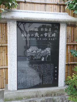 埋め戻された龍閑川の道を江戸通りに平行して東に中央通りを越え、昭和通りも通り過ぎて200mほど来ると、右側に十思公園がでてきますが、ここに「吉田松陰終焉の地」(6)と「石町(こくちょう)時(とき)の鐘」(7)と「伝馬町牢屋跡」(8)の碑があり、公園の北隅に故郷の萩城跡付近より掘り出された石に「身はたとひ武蔵の野辺に朽ちぬとも留め置かまじ大和魂」の松蔭の辞世の句碑があり、公園のほぼ真ん中辺に鐘楼があり、石町時の鐘があり、これは江戸の本石町(ほんごくちょう)(現在の日本橋室町四丁目の先に述べた長崎屋の辺り)に城下の人々に時を知らせた鐘で現物は宝永8年に改鋳されたもので、現在地に移転された理由は不明、また吉田松陰の石碑の横にひっそりと「伝馬町牢屋跡」の説明版があり、旧北町奉行所のあった常盤橋外より慶長年間に移転され明治8年まで存在し、獄舎は揚座敷、揚屋、大牢、および女牢部屋にわかれ、90~130人の収容が可能で、吉田松陰の安政大獄時には90人が収容されたとのこと、広さは、十思公園とその傍の村雪別院(9)と大安寺が跡地に建てられた。 |